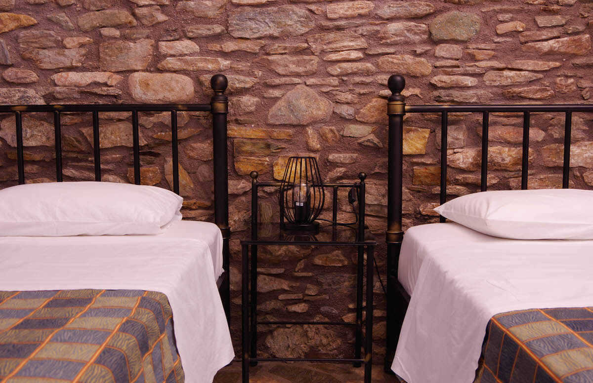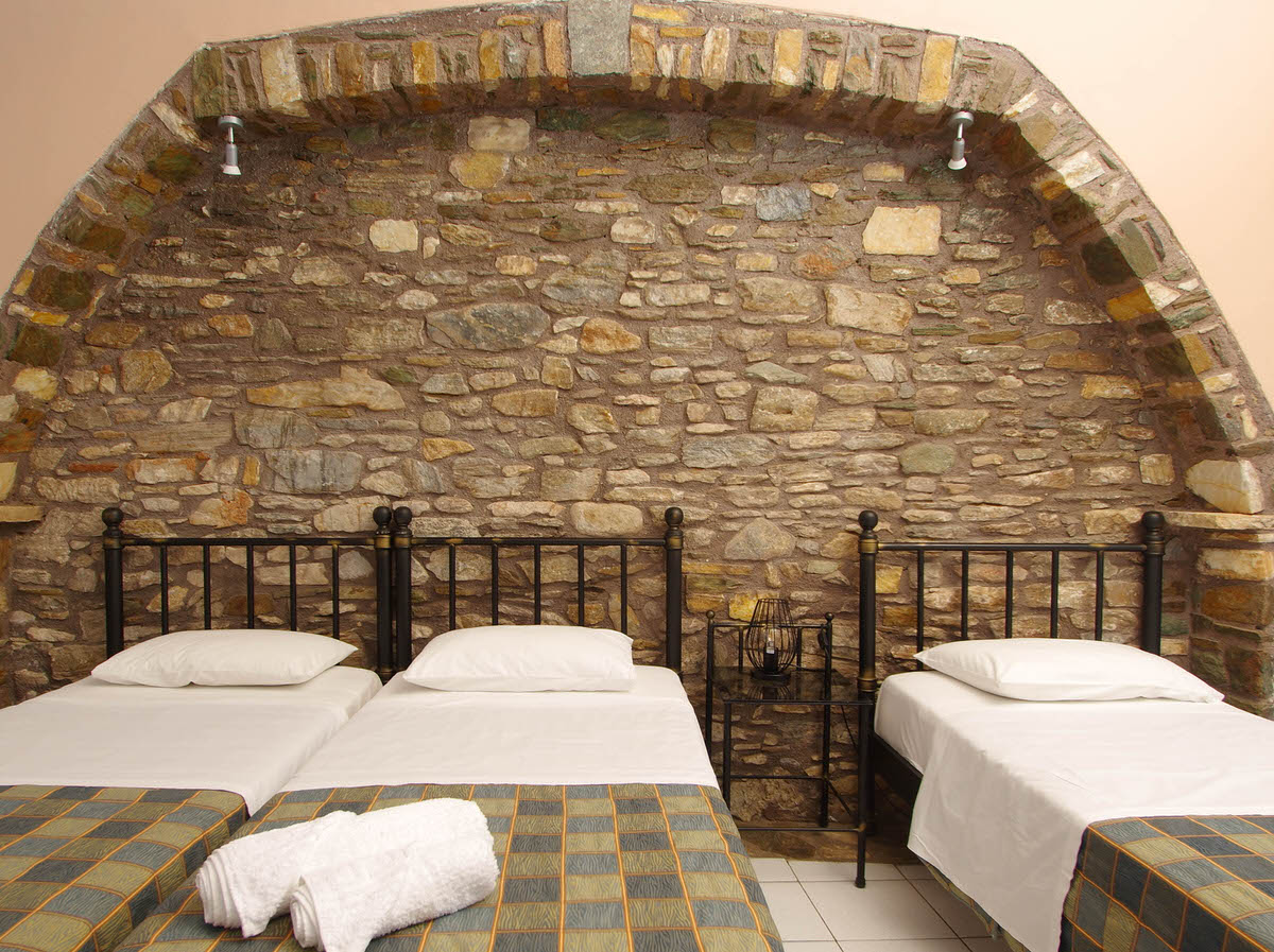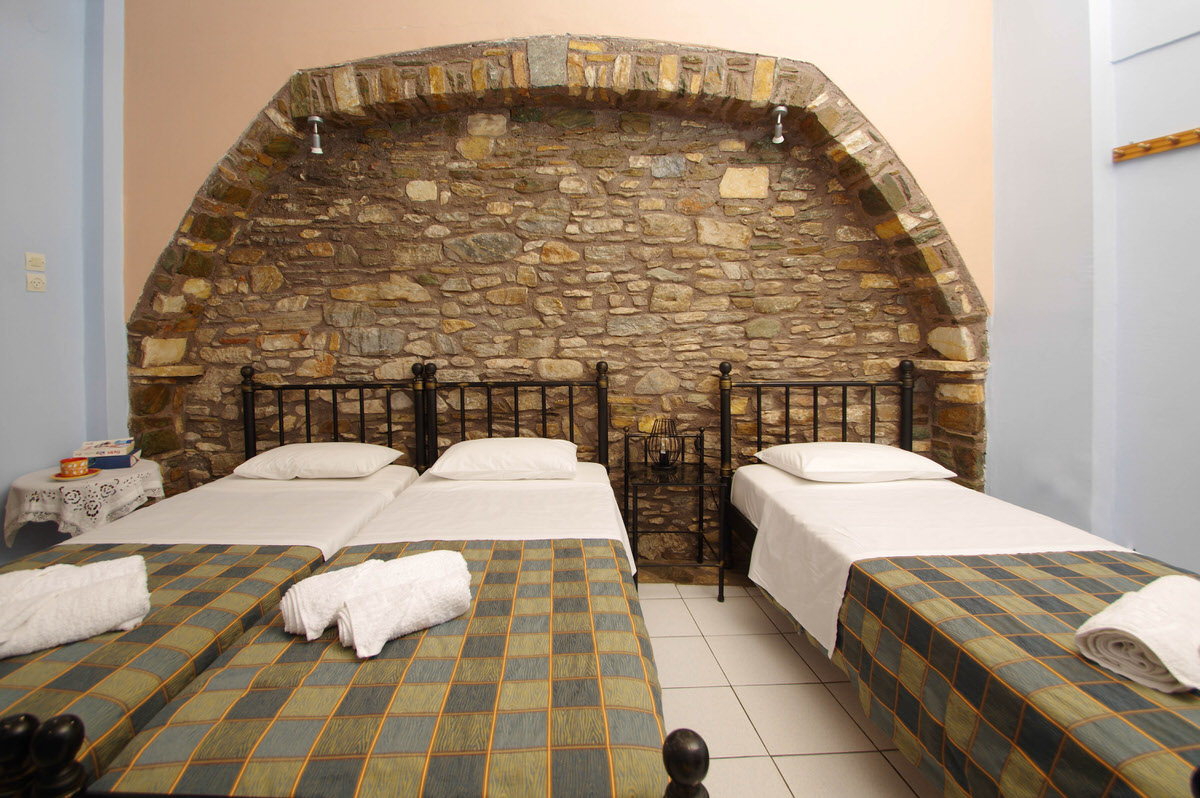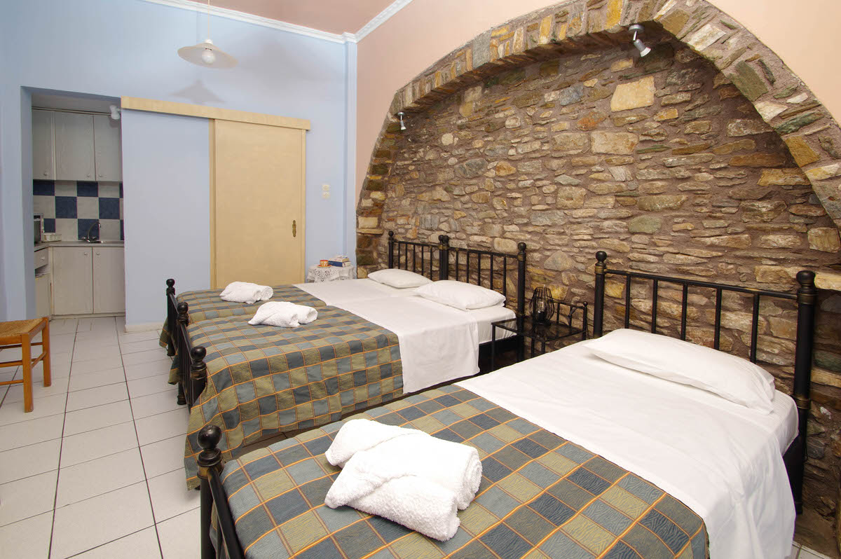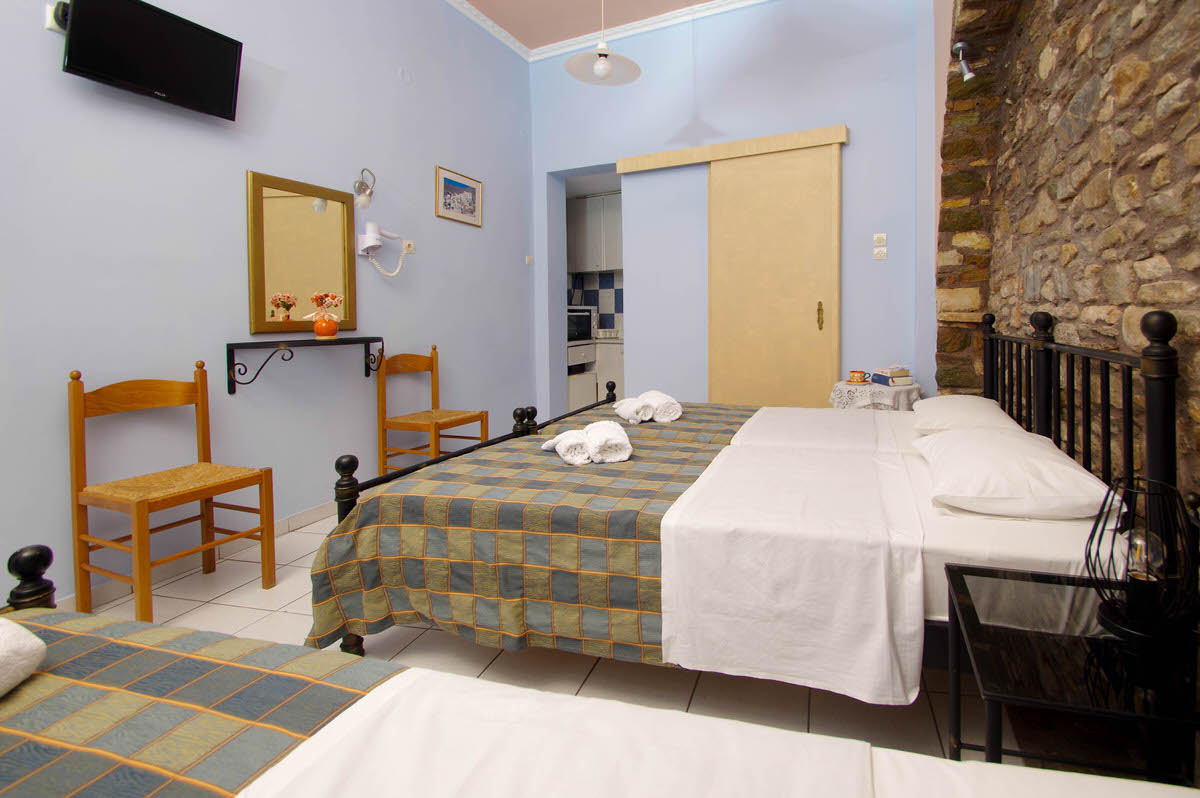 Petrino Room took its name from the stone decorative elements mimicking the unique Cycladic stone houses. The room offers full accommodation during summer and winter with ample space (20m²) to host 3 persons. Petrino Room consists of the main bedroom, separate kitchen and bathroom. The kitchen is fully equipped with sink, oven, kettle, toaster, and kitchen utensils (dishes, forks, spoons, knives, cups) to prepare an excellent breakfast or just a cup of coffee. The bathroom is equipped with a toilet and shower enclosure. This room is located on the ground floor of the guesthouse for easy access and an unobstructed view of the Pefkakia park with the lush pine trees.