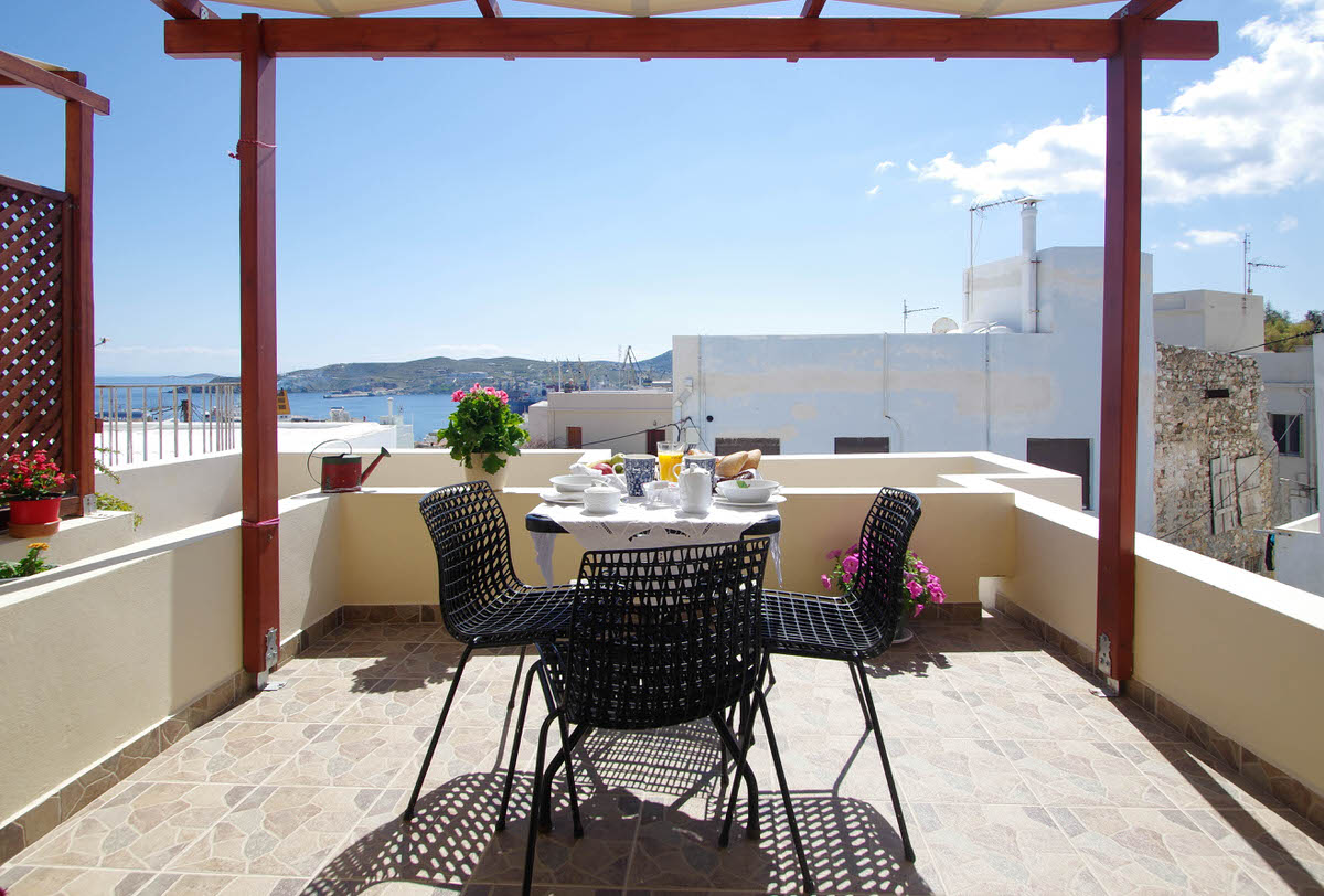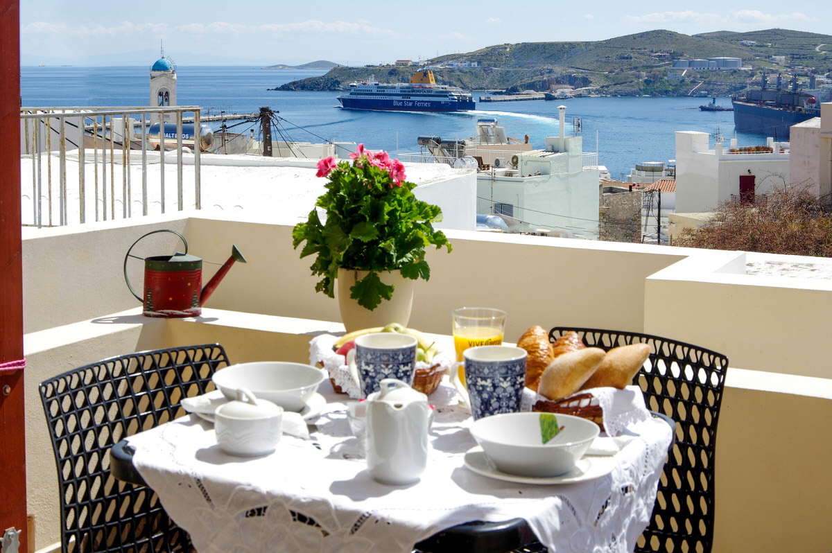 Our rooftop room offers 360 views overlooking the Aegean Sea, the Cycladic islands of Tinos and Mykonos, the uninhabited island of Gaidouronissi with its famous lighthouse and the traditional town of Ano Syros.
