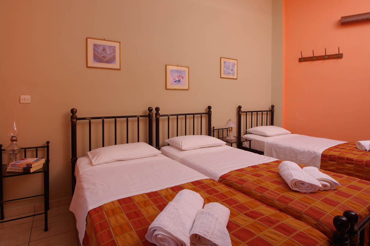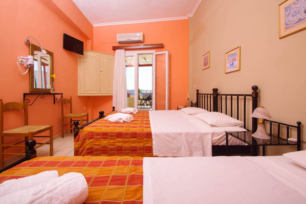 Sunrise Room has ample space (23 m²) to host 3 persons. The room offers full accommodation during both summer and winter periods. Sunrise Room consists of the main bedroom, kitchenette and bathroom. The kitchenette is equipped with a sink, oven, a kettle, toaster, kitchen utensils (dishes, forks, spoons, knives, cups) so that you can prepare an excellent breakfast or just a cup of coffee. The bathroom is equipped with a toilet and a bathtub. This room has a private veranda to enjoy a magical sunrise above the Aegean Sea.